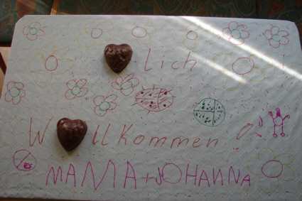 Einen ganz besonderen Empfangstisch haben Papi und ich heute gebastelt. Papi hat gestern extra 2 Herzbackformen mitgebracht, und dann haben wir gemeinsam die Kuchen gebacken und heute mit eingebaut. In der Mitte sind Maikäfer und viele Sonnenblumen drum herum - weil so schönes Wetter ist.