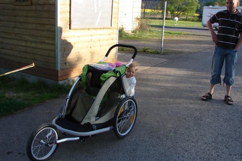 Am nächsten Morgen dann der Schreck - es geht erstmal nur mit dem Croozer los - Einkaufen und dann zum P.? Was das wohl wieder ist, aber die Eltern halten dicht! Papi tut mir leid, der muß nun nicht nur Hanni schieben, auch die Einkäufe sind im Croozer. Aber mit der Zeit hat nicht nur Papi zu tun, auch Biene und Mami machen fast schlapp - ist ja auch kein Wunder, wenn man so einen Berg hoch muß - hoffentlich lohnt es!